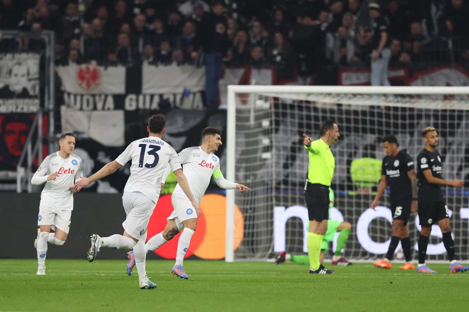 A hesseniek a mérkőzés elején még tudták tartani a lépést, de a játék előrehaladtával és Randal Kolo Muani kiállíttatásával megtörte az ellenállásukat. Osimhen a félidő előtt, di Lorenzo pedig a félidő után szerezte a végeredményt jelentő gólokat. Ezt megelőzően Kvaratkshelia még egy büntetőt is kihagyott. A nápolyiak így a mostani CL-szezonban a hat büntetőből hármat kihagytak.