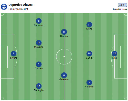 Главният треньор Едуардо Кудет няма сериозни кадрови проблеми и може да разчита на почти всички свои играчи за предстоящия мач. Не се очакват големи промени в стартовия състав на Алавес в сравнение с последния мач.