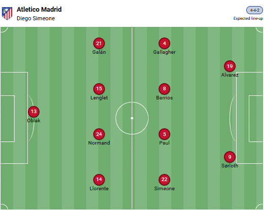Диего Симеоне няма проблеми с контузени играчи. Въпреки това, все още не е ясно с какъв стартовен състав гостите ще излязат на терена в Баския, тъй като Симеоне има възможност да направи ротация в настоящата ситуация в класирането.