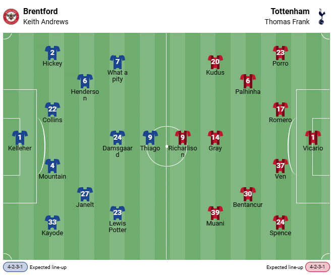 Досега между двата отбора са се състояли общо 51 срещи, като Тотнъм води в прякото сравнение с 28 победи. Спърс спечелиха последните четири мача от Висшата лига срещу Брентфорд ФК и останаха непобедени в последните си четири гостувания на стадион „Брентфорд Комунити“ (една победа, три равенства).