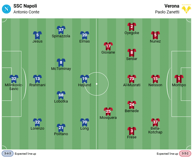 Верона, от друга страна, не е печелила в 20 гостувания в Неапол, като е загубила 15 от тях. Като цяло, Gialloblù има само една победа в последните девет официални мача срещу SSC – в последния домакински мач през миналия сезон с 3:0. През настоящия сезон те спечелиха само един от десетте гостувания и освен това са втората най-слаба отбрана като гост в лигата. Надеждите за евентуално спечелване на точки са съответно малки.