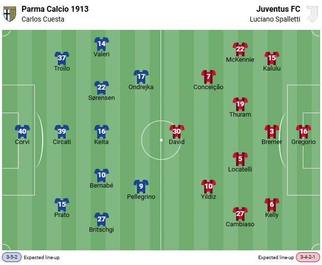 Досега между двата отбора са се състояли общо 72 срещи, като Ювентус Торино води в прякото сравнение с 39 победи. Зеврете загубиха последния си гостуване на Парма Калчо (0:1). Това обаче беше единствената загуба на Веккия Синьора в последните девет срещи с Джаллоблу (шест победи, две равенства).