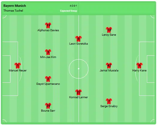 По-назад на терена обаче нуждата е голяма. Де Лигт контузи коляното си в Саарбрюкен не по своя вина и може да не изиграе друг мач през 2023 г. Упамекано се завърна към тренировките на тима тази седмица, но все още е извън строя, след като скъса мускулни влакна. Въпреки това французинът вероятно ще трябва да започне от самото начало. Особено защото треньорът Тухел не разполага и с опции в централната полузащита. Горетцка се завръща след контузия, Кимих е отстранен, а треньорът може би би предпочел Лаймер като десен бек вместо непостоянния Мазрауи.