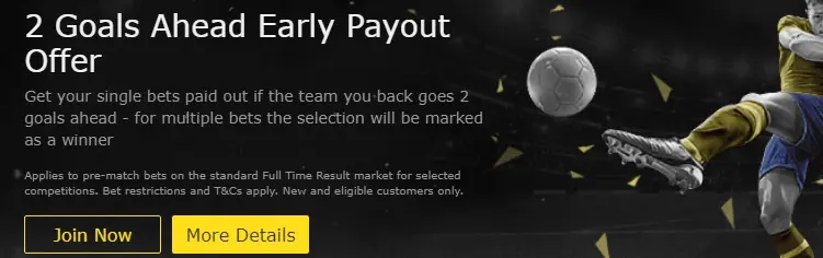 Mimořádně populární propagací je dřívější výplata za dva góly vedené jejich týmem. Tato nabídka platí pouze pro nové zákazníky v Bet365.