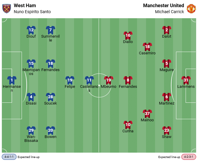 Red Devils pod vedením Michaela Carricka nakonec vyhráli všechny čtyři zápasy, a to i přesto, že se utkali s těžkými soupeři, jako jsou Manchester City (2:0), lídr tabulky Arsenal (3:2) a vítěz Evropské ligy Tottenham (2:0). Proto je u zápasu West Ham proti Manchesteru United logické tipovat, že rekordní mistr, který se již vrátil na čtvrté místo, si pátým vítězstvím v řadě upevní svou pozici.