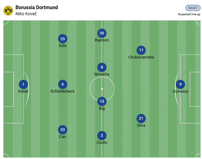 Βασικά, η πρόβλεψη για τους μαύρους-κίτρινους είναι ευνοϊκή μεταξύ Ντόρτμουντ και Γκλάντμπαχ. Άλλωστε, η BVB κέρδισε τα τελευταία έντεκα εντός έδρας παιχνίδια εναντίον των Φόλερν στην γερμανική πρώτη κατηγορία. Οκτώ νίκες από τα τελευταία δέκα εντός έδρας παιχνίδια της BL συνολικά αποτελούν επίσης ένα επιχείρημα υπέρ της BVB. Και αυτό, παρόλο που ο προπονητής Kovac θα αναγκαστεί για άλλη μια φορά να αναδιαμορφώσει την τριάδα της άμυνας του στο τέλος του έτους. Ο Ramy Bensebaini, σκόρερ στο 1-1 της προηγούμενης εβδομάδας εναντίον της SC Freiburg, βρίσκεται στην αλγερινή αποστολή για το Κύπελλο Αφρικής και ως εκ τούτου θα απουσιάζει την Παρασκευή το βράδυ.