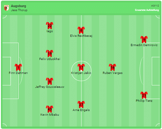 Η Άουγκσμπουργκ εξακολουθεί να βρίσκεται στην σταθερή ενδέκατη θέση χάρη σε ένα καλό ενδιάμεσο διάστημα υπό τον Τζες Θόρουπ. Ωστόσο, δεν πάνε όλα καλά για την Fuggerstädter. Έχουν κερδίσει μόνο ένα από τα οκτώ τελευταία παιχνίδια τους, εκτός έδρας στο Μόνχενγκλαντμπαχ. Πρόσφατα, πάντως, κράτησε ισόπαλη εντός έδρας την RB Λειψίας, με την επίθεση του Ντεμίροβιτς κυρίως να έχει ξανά διάθεση για γκολ στο 2-2.