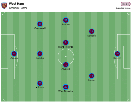 Graham Potter no podrá contar con cuatro jugadores de la plantilla por lesión contra los Toffees. Por el momento, los visitantes londinenses no tienen que lamentar más problemas de personal. En comparación con el equipo que jugó contra el Newcastle, no se esperan grandes cambios en el West Ham.