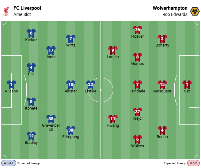 Al final del año, el LFC afronta la que se supone que es la tarea más fácil de toda la temporada. Contra los «Wolves», que aún no han ganado ningún partido, cualquier resultado que no sea una victoria clara sería una gran sorpresa. Debido a la ausencia de Salah y a la lesión de Isak, es muy posible que Hugo Ekitike vuelva a ser el protagonista con un gol.