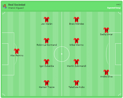 Viime aikoina on ollut useita poissaolijoita, kuten uusi sopimuspelaaja Becker, ja myös joukkueen kapteeni ja tähti Oyarzabal ei ollut käytettävissä. PSG:tä vastaan lääkintähenkilökunta yrittää tehdä kaikkensa, jotta toipilaat saadaan jälleen pelikuntoon. Laatua on kuitenkin tarjolla, Kubon, Mendezin, Merinon tai Zubimendin kaltaiset pelaajat voidaan hyvällä omallatunnolla luokitella Euroopan kärkiluokkaan.