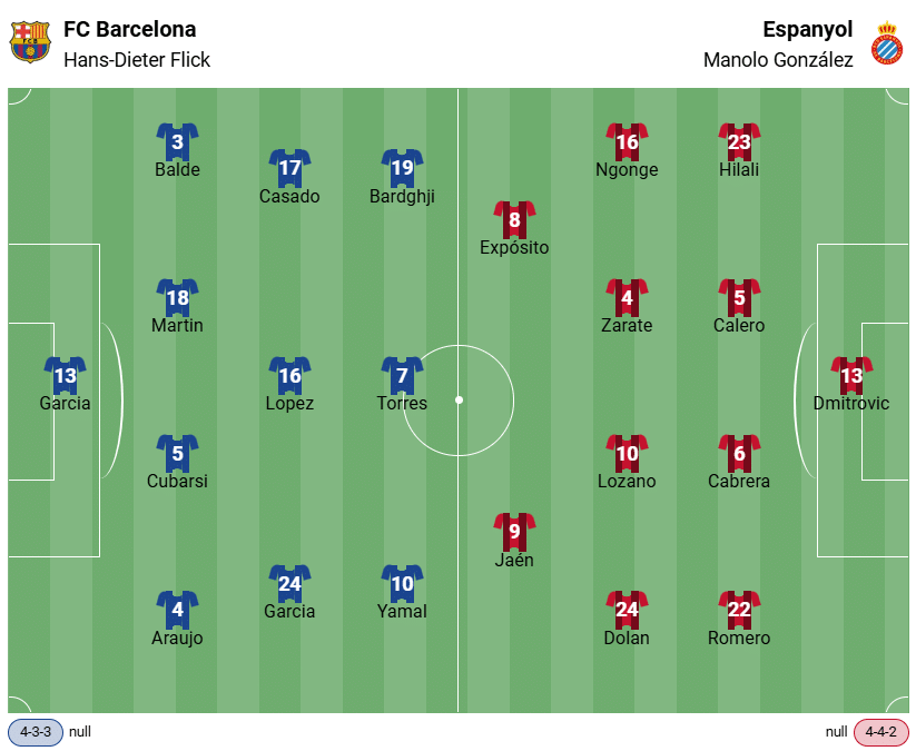 Mais comme l’accent devrait être mis sur la Ligue des champions ces prochaines semaines, nous nous attendons plutôt à une victoire pragmatique et indispensable qu’à une large victoire et une avalanche de buts. Une rotation visant à ménager les titulaires en vue du match retour crucial de la Ligue des champions n’est en aucun cas exclue lors du prochain match de championnat. En tête de liste, la superstar Lamine Yamal, qui pourrait même passer les 90 minutes contre l’Espanyol entièrement sur le banc. .