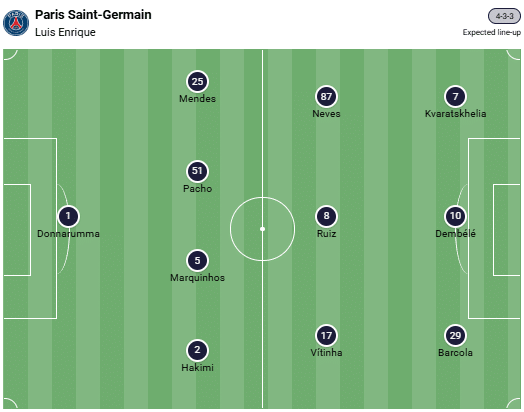Luis Enrique-nek ezen a mérkőzésen nincsenek komolyabb személyi gondjai, és nagyrészt a teljes keretből meríthet. A Ligue 1-ben legutóbb a LOSC ellen 4-1-re nyerő kezdő XI-hez képest csak minimális változtatás várható a hazaiaknál. Ousmane Dembélé továbbra is a PSG legjobb góllövője, és az LFC ellen is esélyes lesz a pontszerzésre.