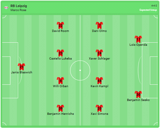L’allenatore Marco Rose al momento non ha quasi nessun problema di organico. Solo l’assenza di Lukas Klostermann al centro della difesa è un problema. Accanto all’ancora difensivo Willi Orban, l’allenatore dovrà quindi optare per il giovane Lukeba o Simakan. In attacco, non crediamo sia da escludere che l’ex giocatore del Dortmund schieri dall’inizio le sue quattro armi migliori con Sesko, Olmo, Simons e Openda, lanciando così subito un segnale ai madrileni. I difensori centrali non vogliono assolutamente nascondersi al Bernabéu!