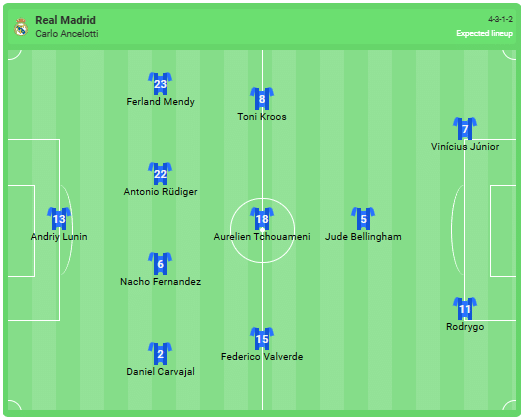 Infine, diamo un’occhiata alla situazione dell’organico, che ultimamente si è un po’ alleggerita. Tuttavia, due centrali fissi, Alaba e Militao, sono ancora fuori. La stella della DFB Antonio Rüdiger è rientrato dall’infortunio e dovrebbe formare il centro della retroguardia mercoledì sera insieme al sostituto del difensore Tchouameni. Andriy Lunin, autore di un’ottima prestazione all’andata con otto parate, continuerà a mantenere la porta. A parte questo, Don Carlo può praticamente contare su una rosa completa.