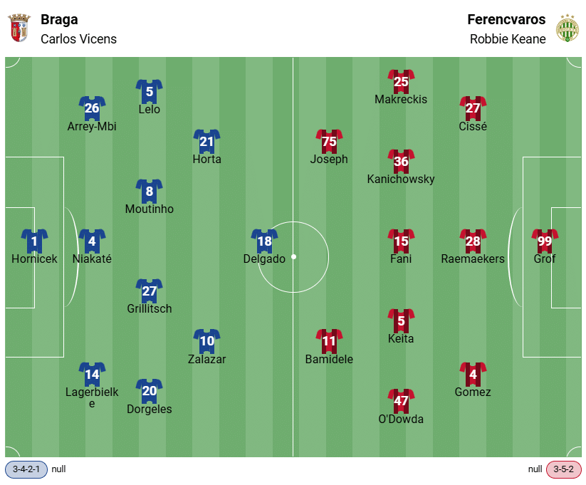 Ferencvaros wygrał pierwszy mecz 2:0, zapewniając sobie tym samym dobrą pozycję wyjściową. Bramki strzelili Gabi Kanichowsky i Lenny Joseph. Co ciekawe, Braga miała wyraźną przewagę w meczu, posiadając piłkę przez 70% czasu, ale ostatecznie oddała mniej strzałów na bramkę niż drużyna z Budapesztu.