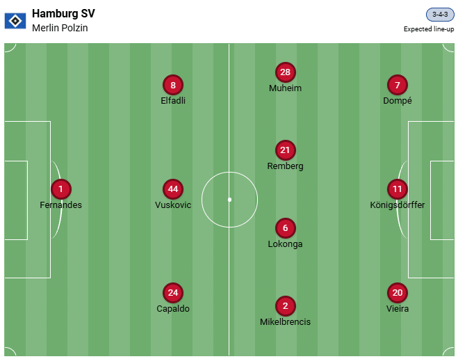 O Hamburger SV, seis vezes campeão alemão e antigo vencedor da Taça dos Campeões Europeus, tem, em princípio, grandes ambições. No entanto, após o longo interlúdio na 2.ª Bundesliga, o modesto objetivo da temporada após o regresso à primeira divisão do futebol alemão é a manutenção na liga. É verdade que os Rothosen ficaram sem vencer duas vezes consecutivas antes da pausa de inverno (um empate e uma derrota). No entanto, com um total de 16 dos 45 pontos possíveis, os homens de Merlin Polzin estão dentro do esperado e ocupam a 13ª posição.