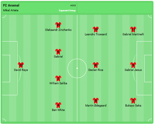 Antrenorul Mikel Arteta va fi lipsit de cel puțin cinci jucători în acest weekend din cauza unor accidentări. Este puțin probabil ca londonezii să facă schimbări majore în 11-le de start.
