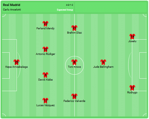 Thibaut Curtois (ruptură de ligamente încrucișate), Kepa Arrizabalaga (adductor), Éder Militao (ruptură de ligamente încrucișate), Aurélien Tchouaméni (fractură de oboseală) și Eduardo Camavinga (ruptură de ligament colateral al genunchiului) lipsesc din apărare. Cu toate acestea, combinația germanofonă formată din Antonio Rüdiger și David Alaba menține apărarea extrem de curată