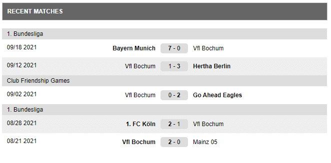Deși Bochum s-a impus direct în a doua zi, acasă, în fața unei formații altfel fulgurante, 1. FSV Mainz 05, în celelalte patru meciuri de campionat au urmat mereu înfrângeri, cu un total de 13 goluri primite în aceste patru partide.