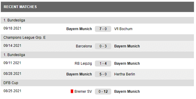12:0 cu Bremer SV în DFB Pokal, 5:0 cu Hertha, 4:1 cu RB Leipzig, 3:0 cu FC Barcelona și în final un 7:0 în săptămâna precedentă cu VfL Bochum Numai în ultimele cinci partide competitive, ansamblul stelist din Säbener Straße are o diferență de goluri senzațională de 31:1.