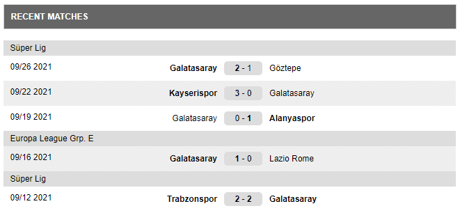 Înainte de recenta victorie de pe teren propriu cu Göztepe, Galatasaray avea o singură victorie în cinci meciuri competitive. În mod surprinzător, acest succes a venit în meciul de deschidere a grupei, contra lui Lazio Roma, unde Leii din Istanbul au beneficiat de o scăpare a portarului advers.