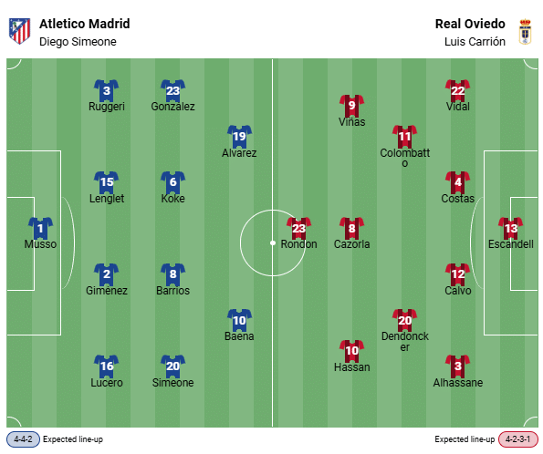 Nevertheless, Atletico Madrid leads the overall record in this match with 34 wins. Real Oviedo won 23 matches, with 18 draws. As expected, the betting odds for Atletico Madrid vs. Oviedo on Sunday once again show the team from the Spanish capital as favorites.