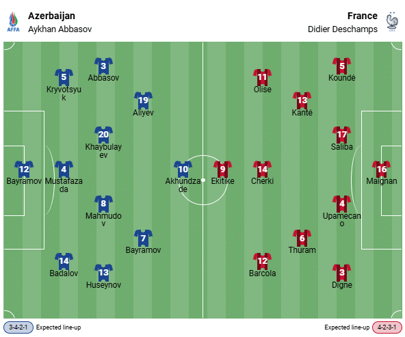 The head-to-head record is quickly dealt with. There have been three meetings between the two teams so far. The first two matches in the mid-1990s (10-0 and 2-0 for France) can be safely disregarded. Far more exciting are the impressions from the first leg, which took place a good month ago at the Parc des Princes in Paris. France won 3-0 in the end, but only had two big chances over the 90 minutes. Azerbaijan defended with everything they had and will certainly not change this approach on Sunday evening in front of their home crowd. It therefore looks set to be another test of patience for Les Bleus.