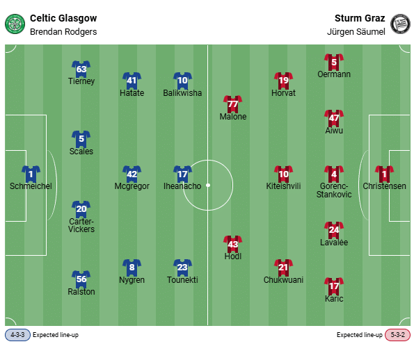 On the first matchday of the league phase, the Styrians suffered a 2-0 defeat at FC Midtjylland. Celtic Glasgow, meanwhile, are once again a cut above in terms of personnel, even though the Hoops lost their only home game 0-2 to Sporting Braga and are not currently in top form under Brendan Rodgers, who is about to play his 63rd international competitive game as Celtic coach. Nevertheless, it should be enough to earn a point against the Schwoazn in what is likely to be a low-scoring game, which is why we see the greatest value in the Celtic Glasgow vs. Sturm Graz prediction in the match combo on the double chance 1X with under 3.5 goals.
