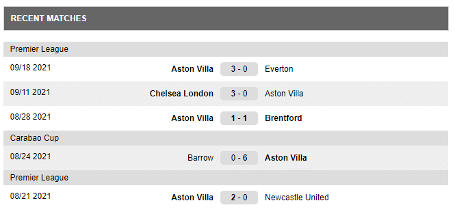 Last matches played by Aston Villa: