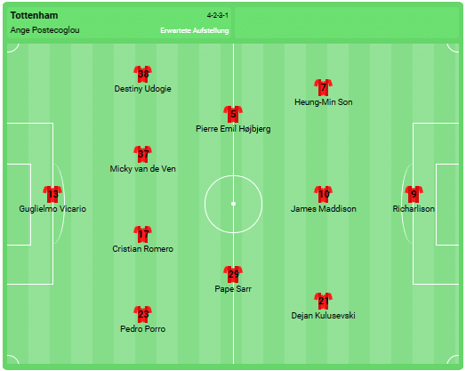 Heung-Min Son (seven goals) and new signing James Maddison (three goals, five assists) are the current guarantors of success. Tottenham have not lost in six away games this season (four wins, two draws). In total, Spurs have already scored 20 goals and only in the narrow 1-0 win against promoted Luton Town did the league leader not score twice.