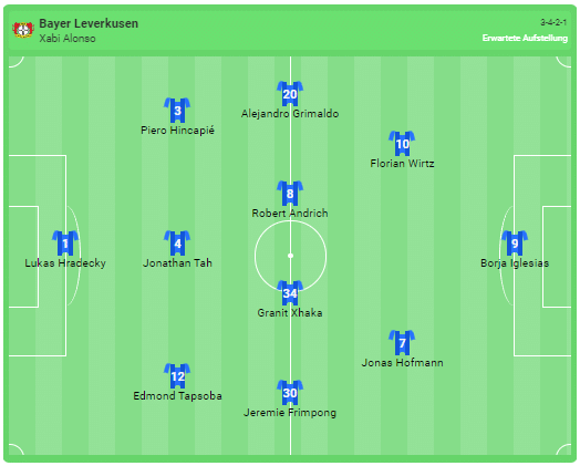 In 15 out of 20 Bundesliga games of the Werkself, the over 2.5 would have gone through. Across all competitions, at least three goals were scored in 24 of 30 competitive matches involving B04. Including in the top games against RB Leipzig (3:2, 3:2), Bayern (2:2) and in the DFB Cup against VfB Stuttgart (3:2). With the exception of Boniface, Xabi Alonso has a virtually full squad to choose from. There is still a small chance that Palacios will play, although he is still struggling with the effects of a muscle injury and will probably be replaced by Robert Andrich on the double-six.