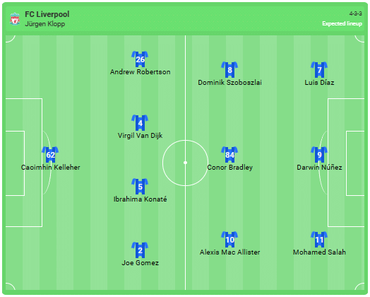Although other statistics suggest that the pendulum will swing in LFC’s favor on Sunday, the tight personnel situation should not be underestimated. Trent Alexander-Arnold, a very important player, is missing through injury. Regular keeper Alisson Becker has to miss out, as do Jota, Gravenberch and Jones. In addition, Mohamed Salah only returned to training during the week and is probably not yet an option from the start.