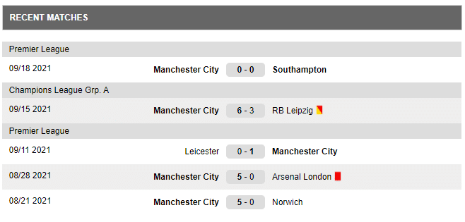 Last matches played by Manchester City: