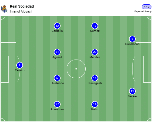 Three of the Basque hosts’ players will miss the first leg against Manchester United due to injury. Real Sociedad are not currently experiencing any other personnel issues. Compared to the team that played against FC Barcelona at the weekend, no major changes are expected at Real Sociedad.