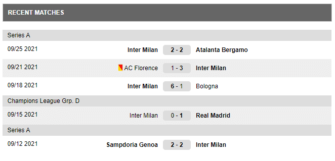 Last matches played by Inter Milan: