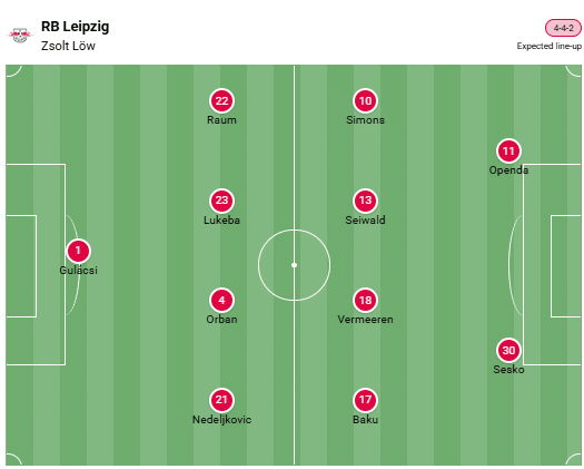 Zsolt Löw has to do without at least four players in the squad due to injury in the Friday game. No major changes are expected in the starting lineup compared to the one that played against Hoffenheim last week. Benjamin Sesko is the top scorer for RB Leipzig this season with his eleven goals and is also a contender to score on this matchday.