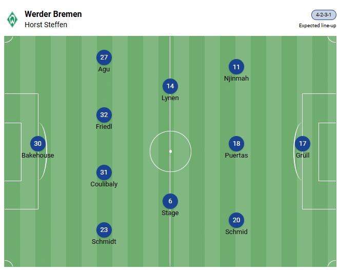 However, it would be disastrous for the home side if Samuel Mbangula, the new signing from Juventus, were to be ruled out due to injury. The attacking player, who impressed across the board last week with his first Bundesliga goal, an assist, and a penalty, is currently suffering from thigh problems. However, coach Steffen is cautiously optimistic about this situation, so ahead of the match between Werder Bremen and Freiburg, it is safe to predict that 21-year-old Mbangula will be in action.
