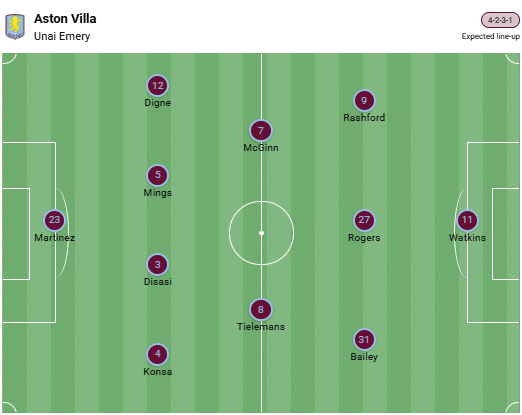 Unai Emery förväntas vara utan tre spelare på grund av skada till den här matchen. Det finns inga andra personalbekymmer för hemmalaget. Jämfört med det lag som var i aktion förra veckan förväntas endast minimala förändringar i Villa. Morgen Rodgers är för närvarande AVFC:s bästa målskytt med tre mål och två assist